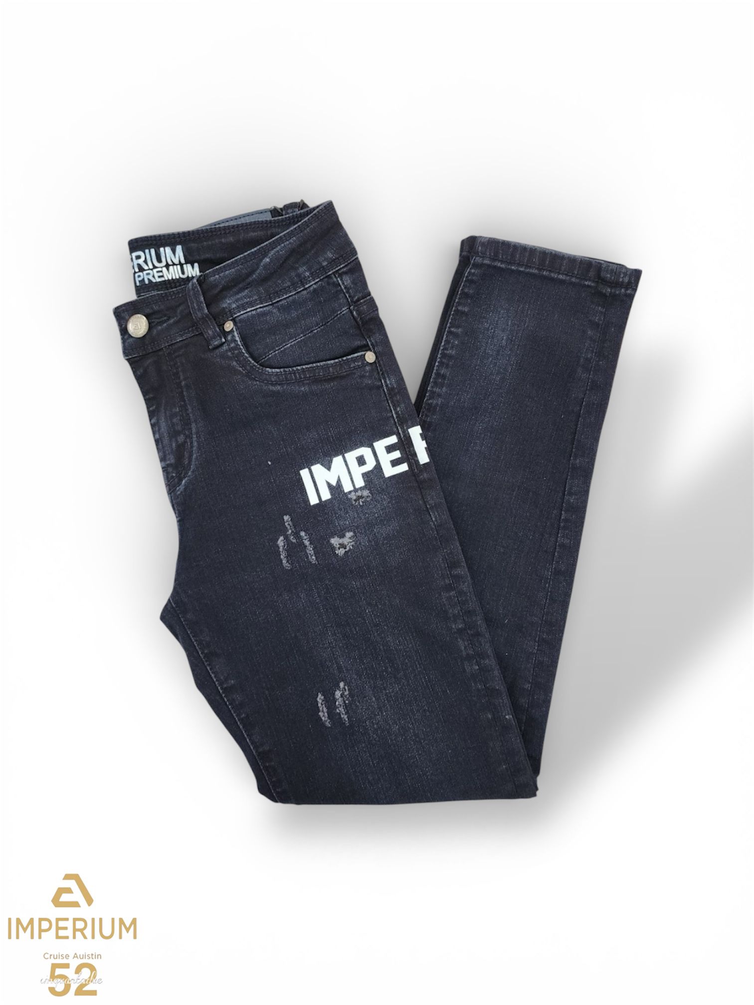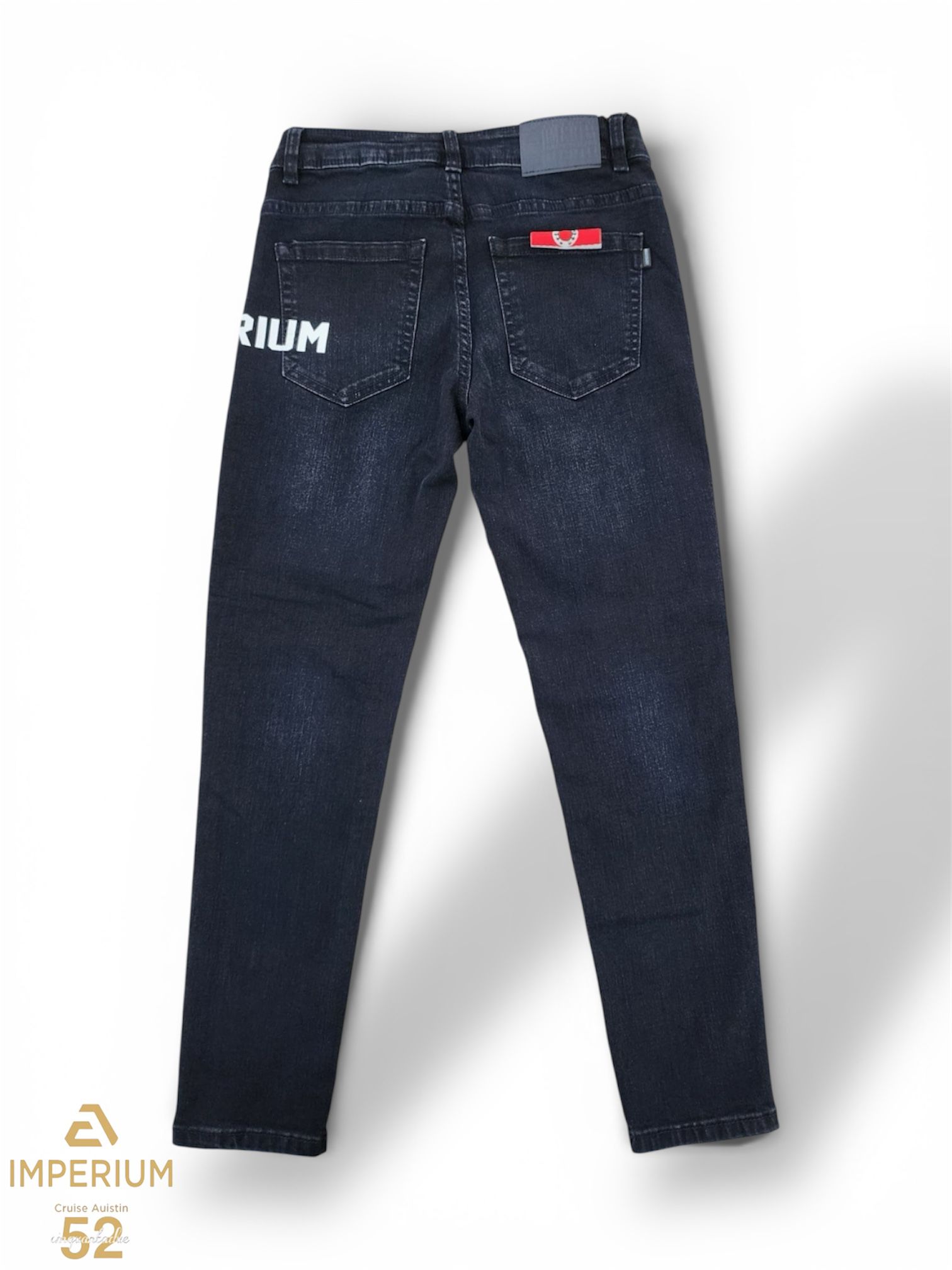 • פרטים מלפנים: הדפס לוגו לבן בולט "Imperium" על ירך שמאל, ושטיפה כהה אחידה עם קרעים דקורטיביים עדינים ופרימות למראה מודרני בסגנון רחוב.