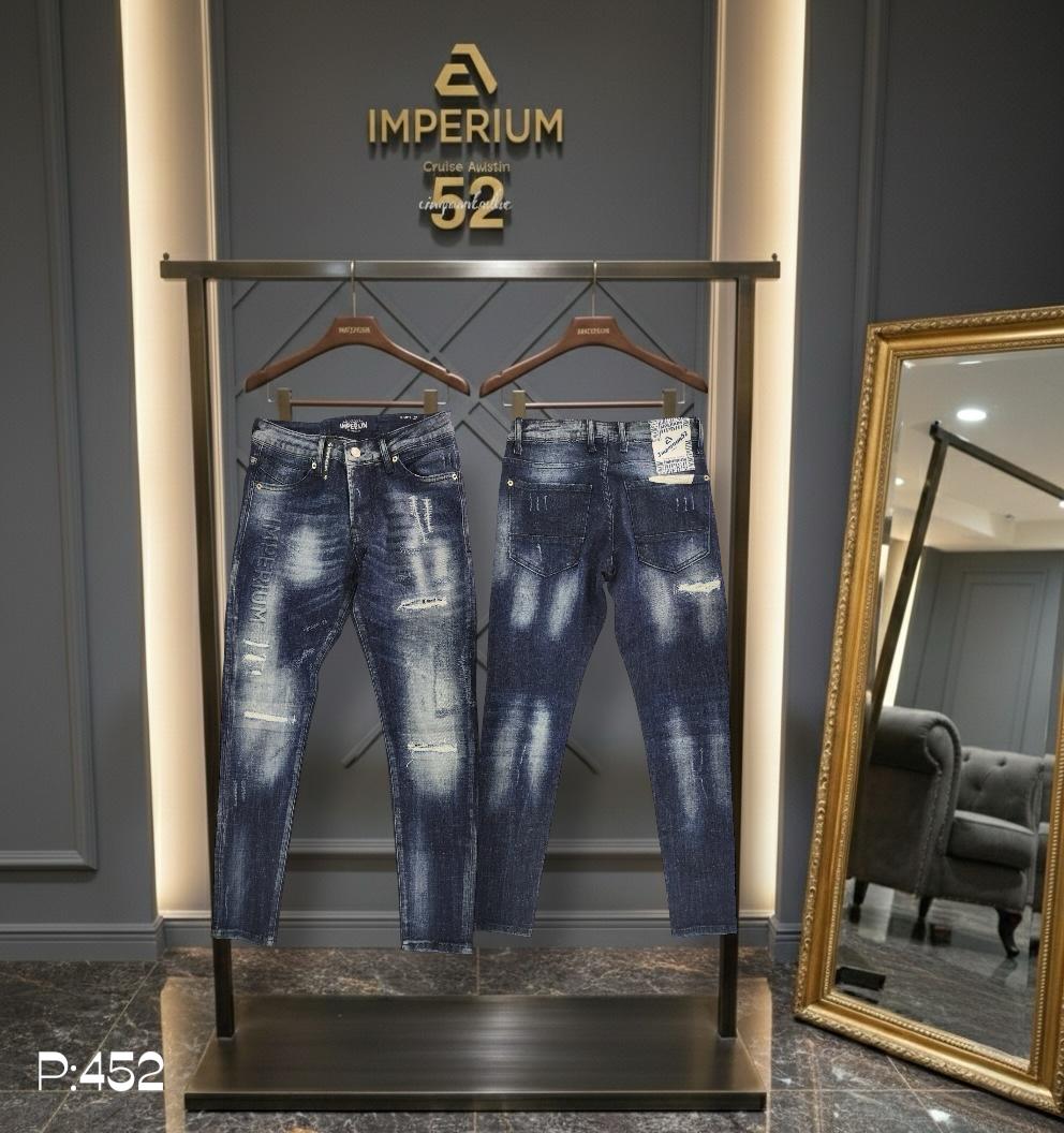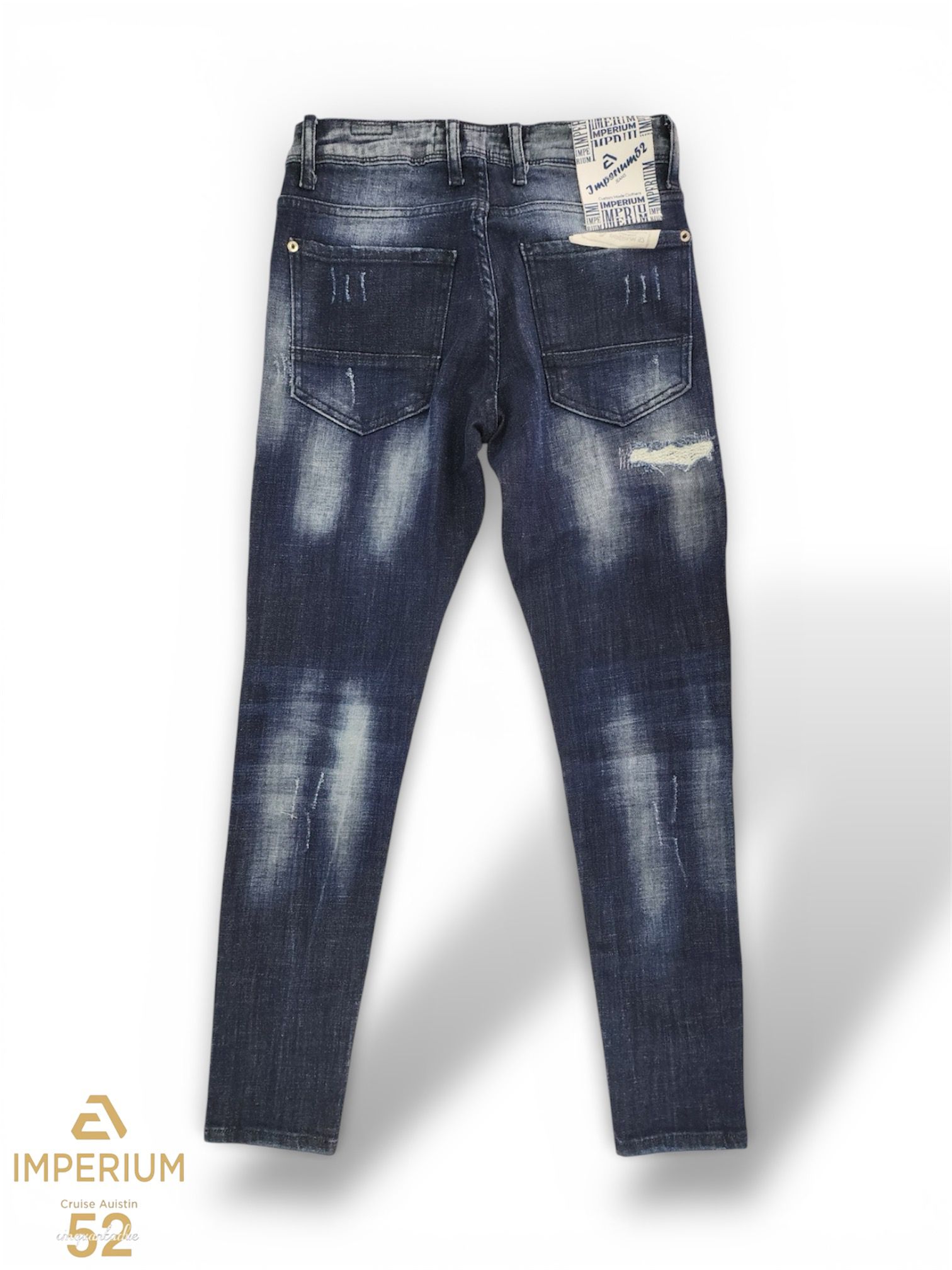 • פרטים מלפנים: הדפס IMPERIUM אנכי דהוי על רגל ימין, פרטים בגימור דהייה רחבה בירכיים ובברכיים.