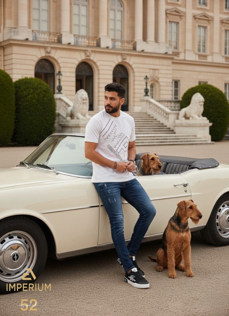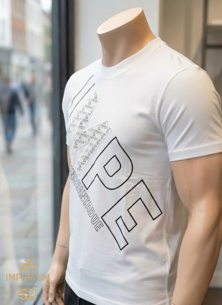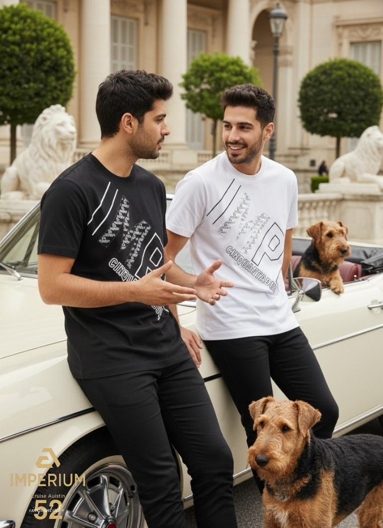 • פרטים בחזית: הדפס אלכסוני גדול של חצי שם המותג "IMPE" מוקף במסגרת לבנה, עם "Cinquantado" באותיות קטנות יותר מתחת, ודוגמה פנימית עדינה המדגישה את האות "M".