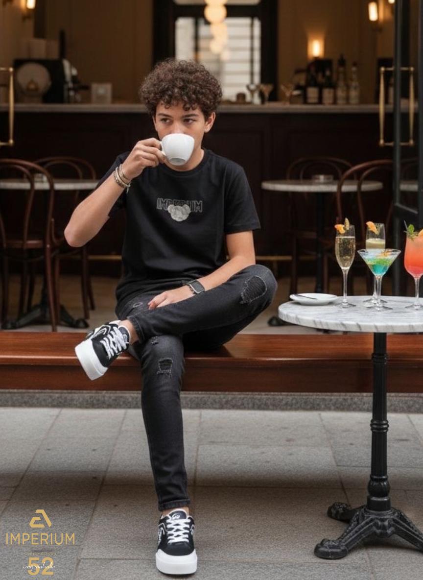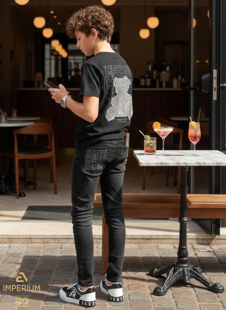 דלג לתוכן• צד קדמי: לוגו המותג "IMPERIUM" במרכז החזה עם הדפס קטן של ראש דובי במראה גיאומטרי (פוליגוני) מודרני.