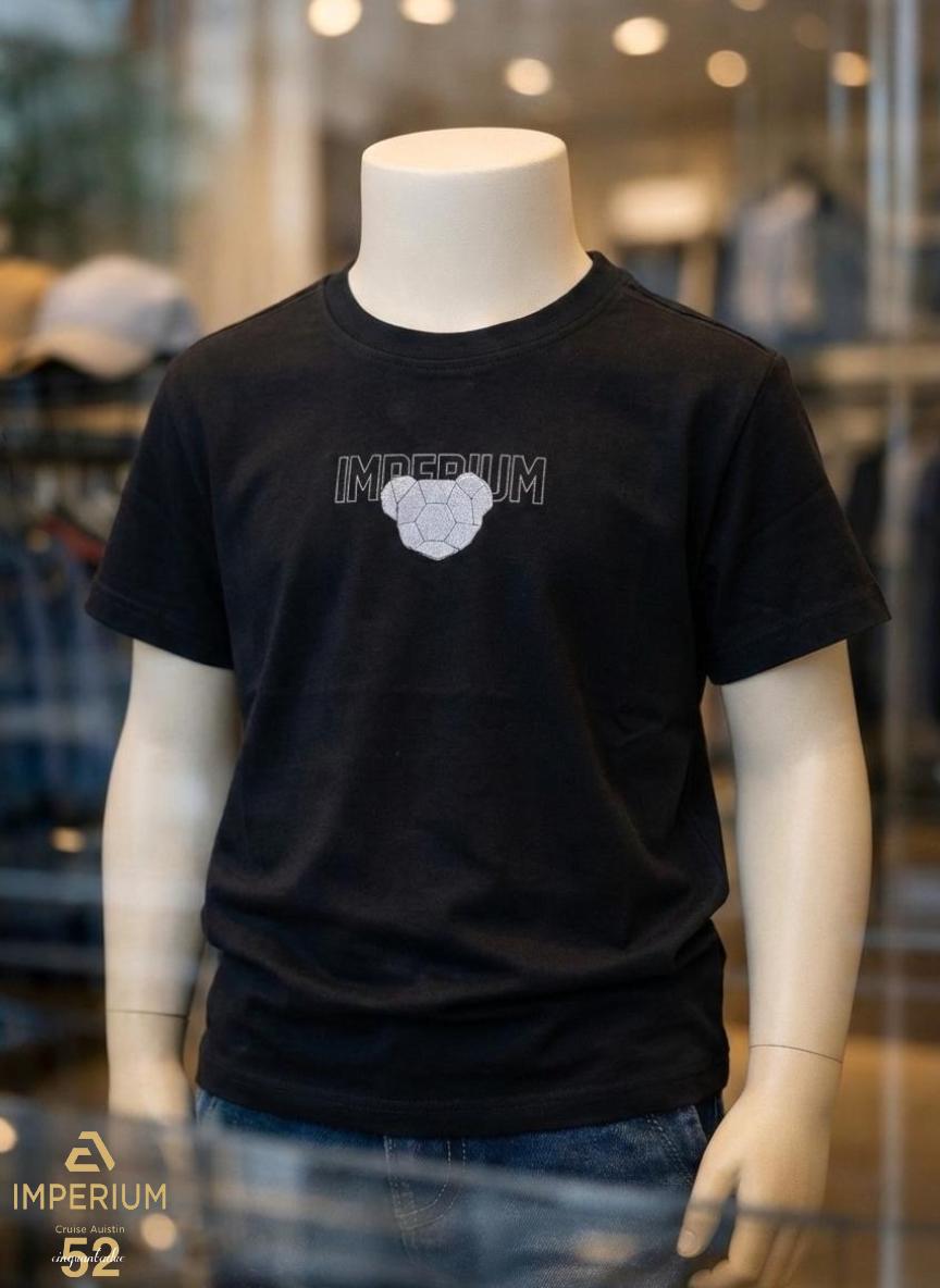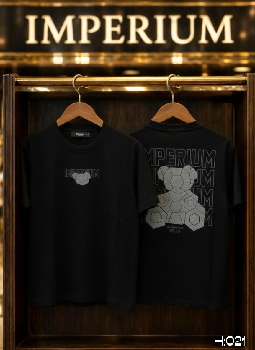 • צד קדמי: לוגו המותג "IMPERIUM" במרכז החזה עם הדפס קטן של ראש דובי במראה גיאומטרי (פוליגוני) מודרני.