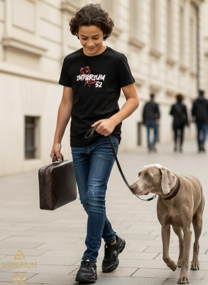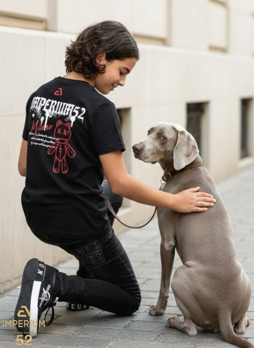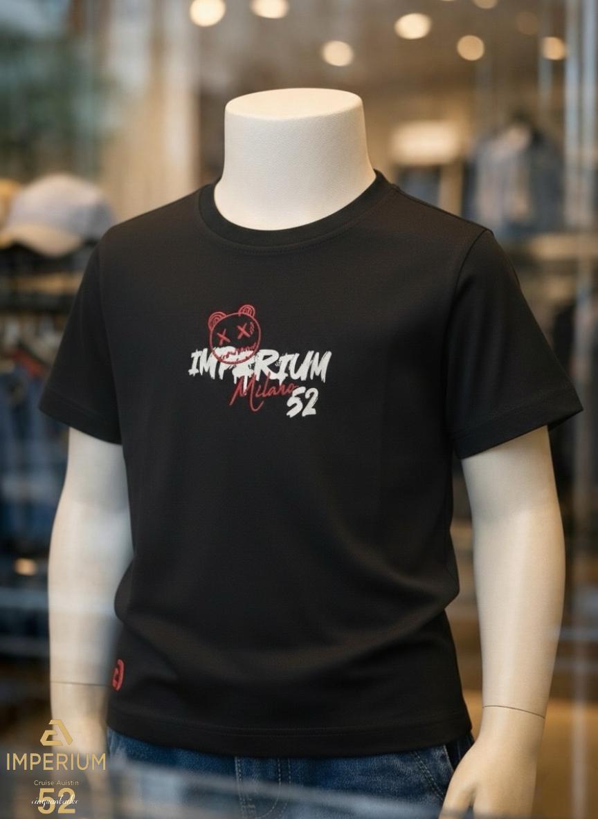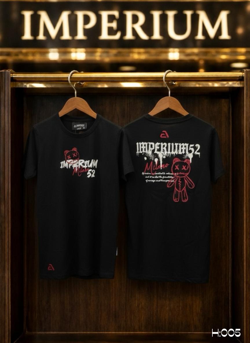 • חזית החולצה: הדפס לוגו "IMPERIUM" בלבן בסגנון גרפיטי, משולב עם המילה "Milano" באדום. מעל הלוגו מופיע איור של ראש דובון עם עיני X באדום למראה אורבני מודרני. בפינה התחתונה מופיע לוגו המותג הרקום באדום.