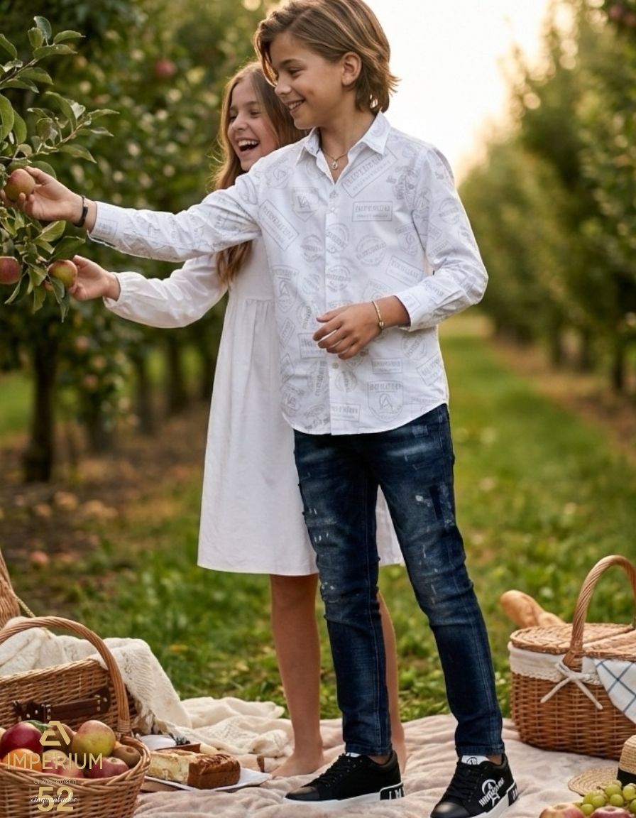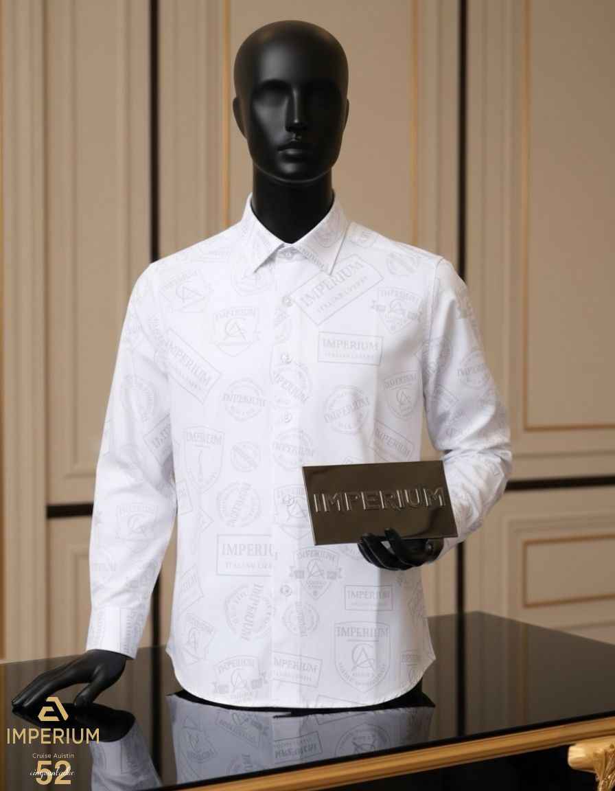 • פרטים מקדימה: צווארון קלאסי מחויט، כפתורים לבנים נסתרים למחצה، והדפס צפוף של סמלי המותג، חותמות וסמלים גרפיים המפוזרים על כל חזית החולצה.