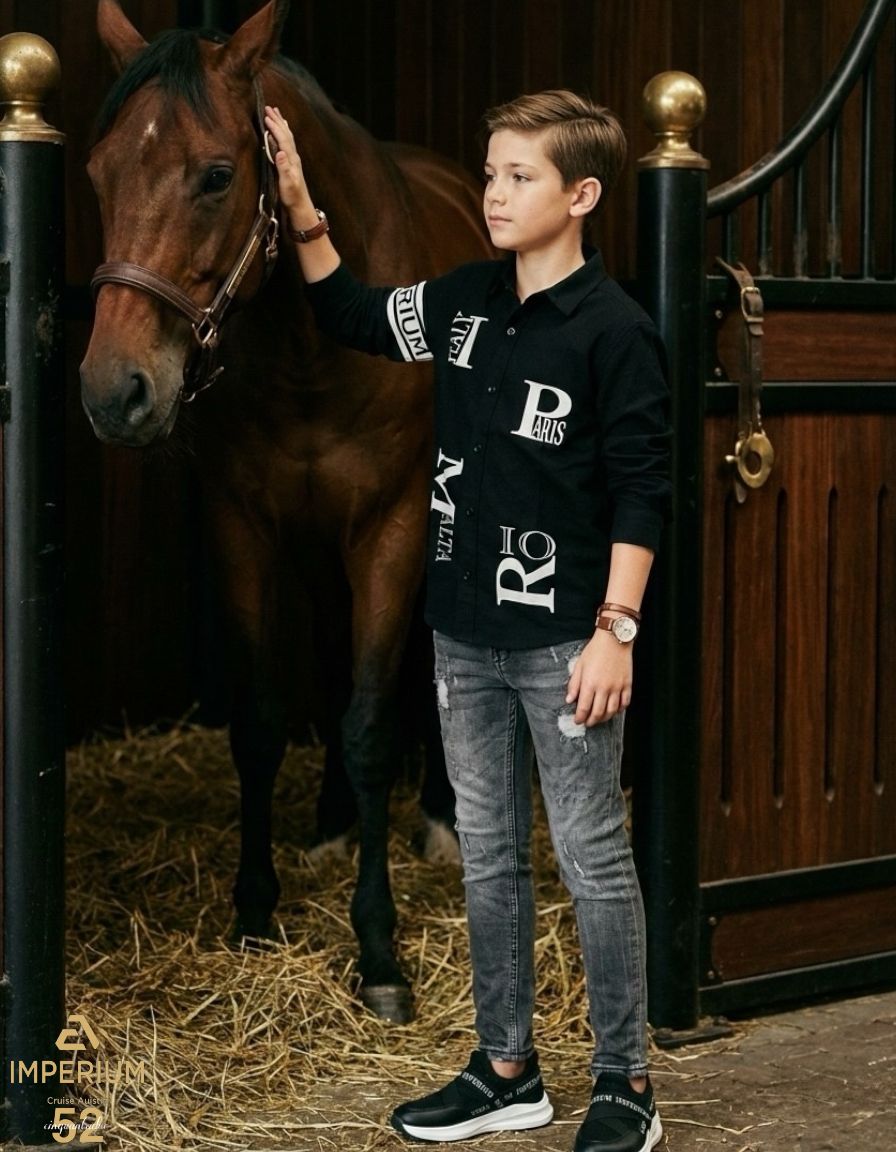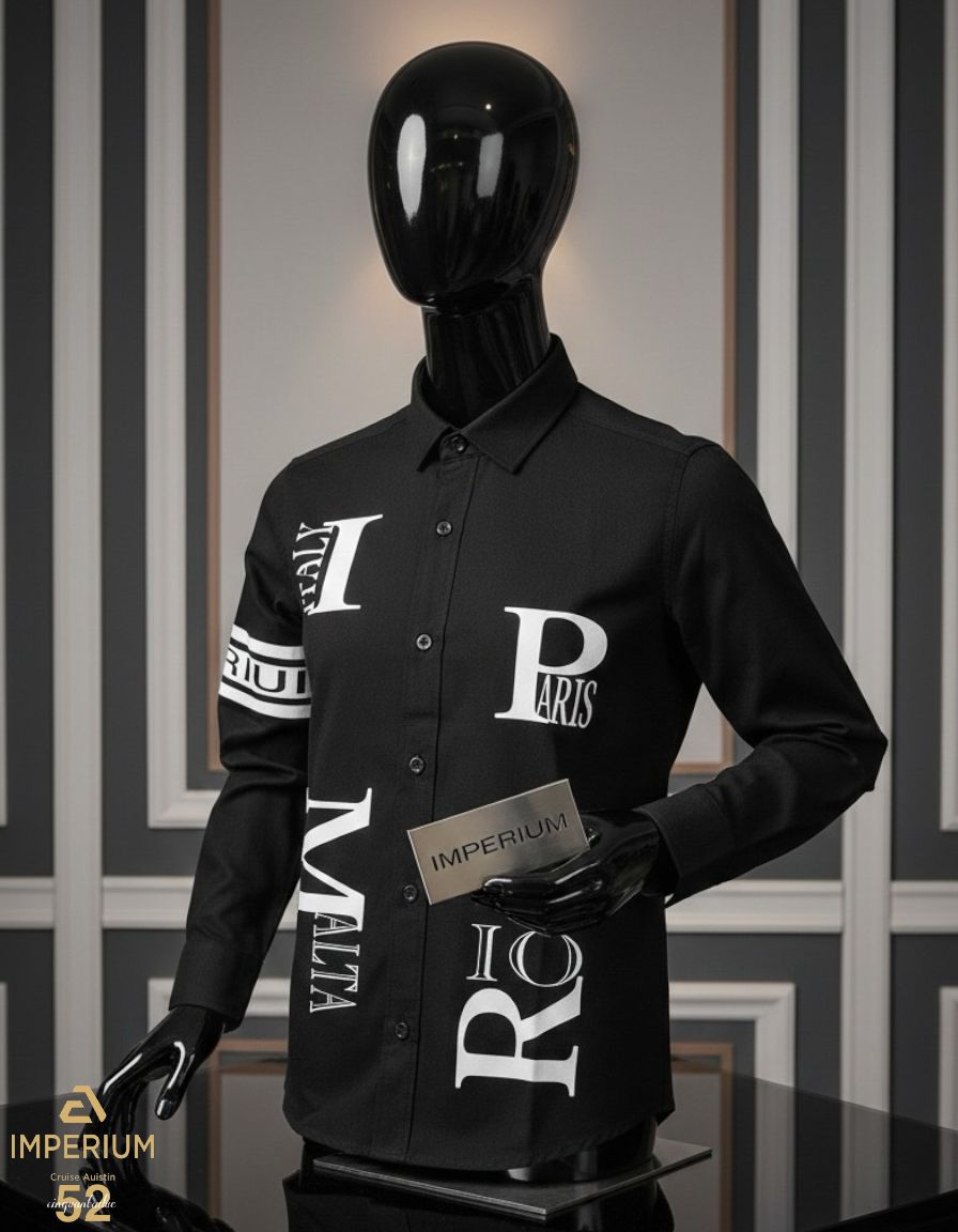 • פרטים מקדימה: צווארון קלאסי מעומד، כפתורים שחורים תואמים، והדפסי אותיות גאומטריים לבנים הכוללים שמות של בירות אופנה כמו PARIS و-ITALY ו-ROMA.
