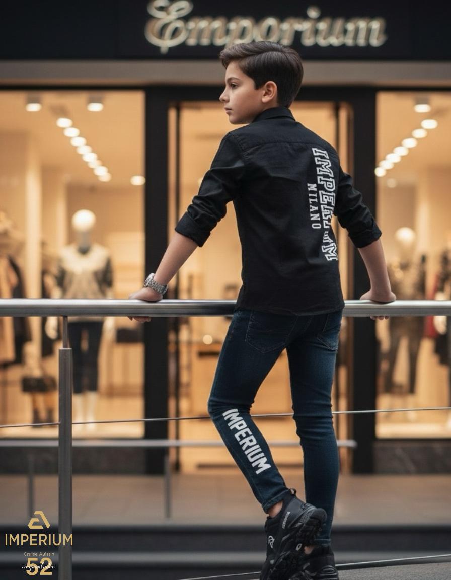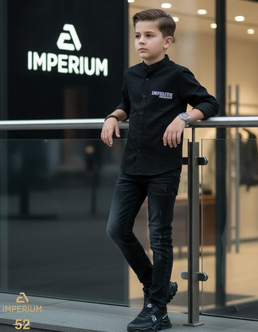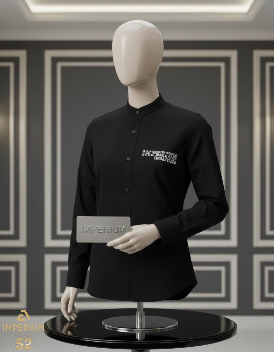 • פרטים מקדימה: צווארון סיני (Mao Collar) מודרני، כפתורים שחורים לאורך החזית، והדפס לוגו לבן "IMPERIUM" מעל הכיס הקדמי.