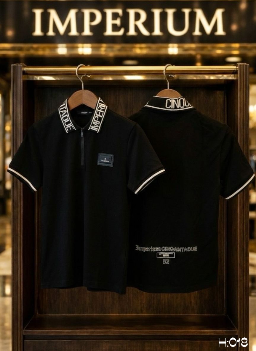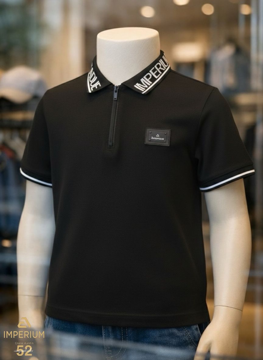 דלג לתוכן* חזית החולצה: עיצוב נקי עם רוכסן (Zipper) איכותי בצווארון במקום כפתורים מסורתיים. בצד שמאל מופיע לוגו המותג Imperium על גבי פאץ' דמוי עור יוקרתי.