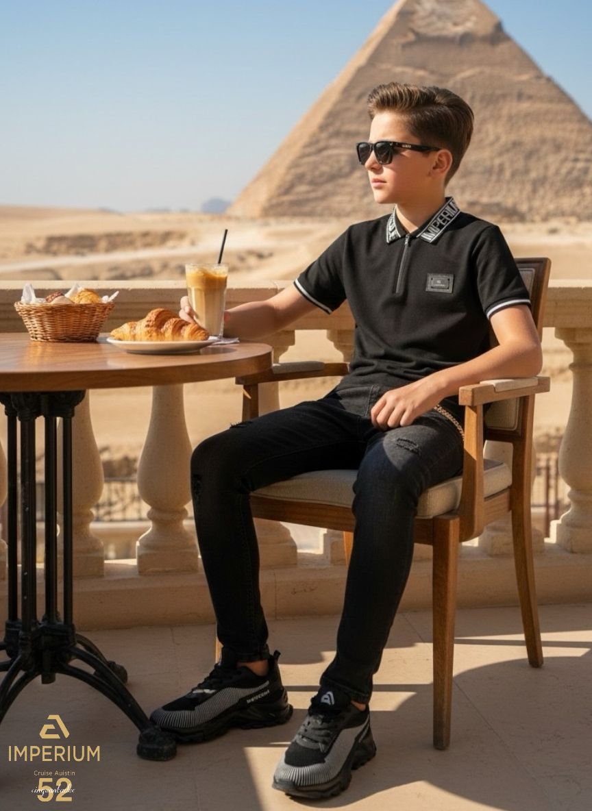 * הצווארון והשרוולים: צווארון בולט עם כיתוב "CINQUANTADUE IMPERIUM" בלבן על רקע שחור. שולי השרוולים מעוטרים בפסים לבנים דקים המעניקים מראה ספורטיבי-אלגנטי.