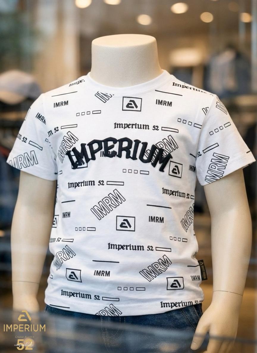 עיצוב: חולצת טי-שירט לבנה לקיץ עם הדפס מלא הכולל את המילים IMRM ו-Imperium 52.
