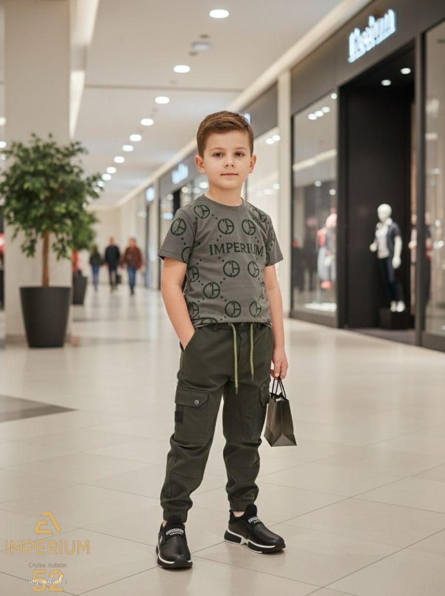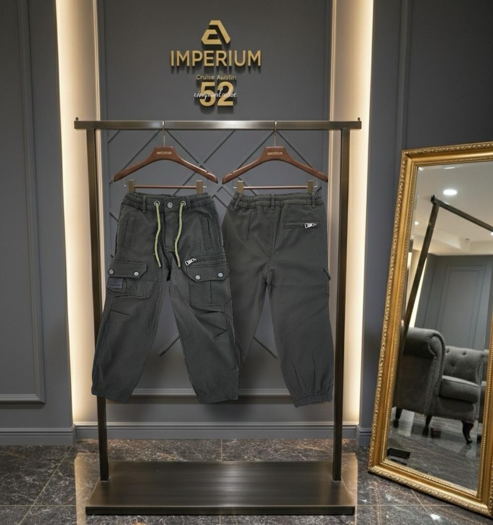 מכנסי קארגו לילדים בצבע זית Imperium Cinquantadue – דגם עם כיסים כפולים ורוכסנים כסופים