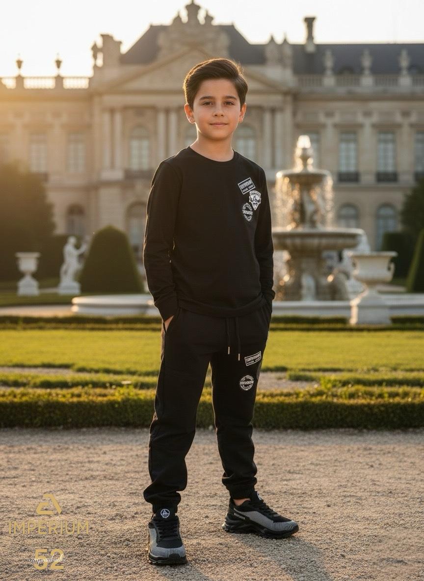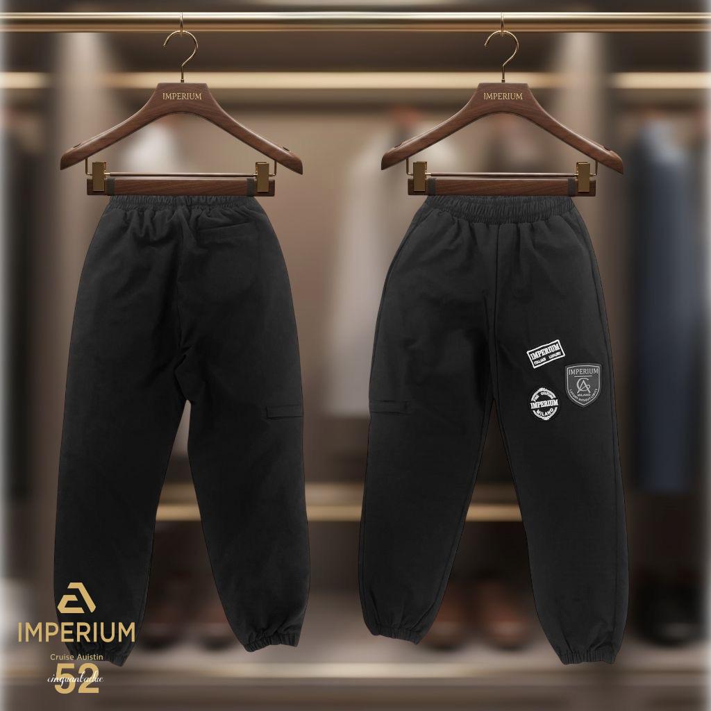 מכנסי קארגו לילדים בצבע שחור, בעיצוב מודרני "IMPERIUM 52" – עם כיסים ולוגואים של המותג
